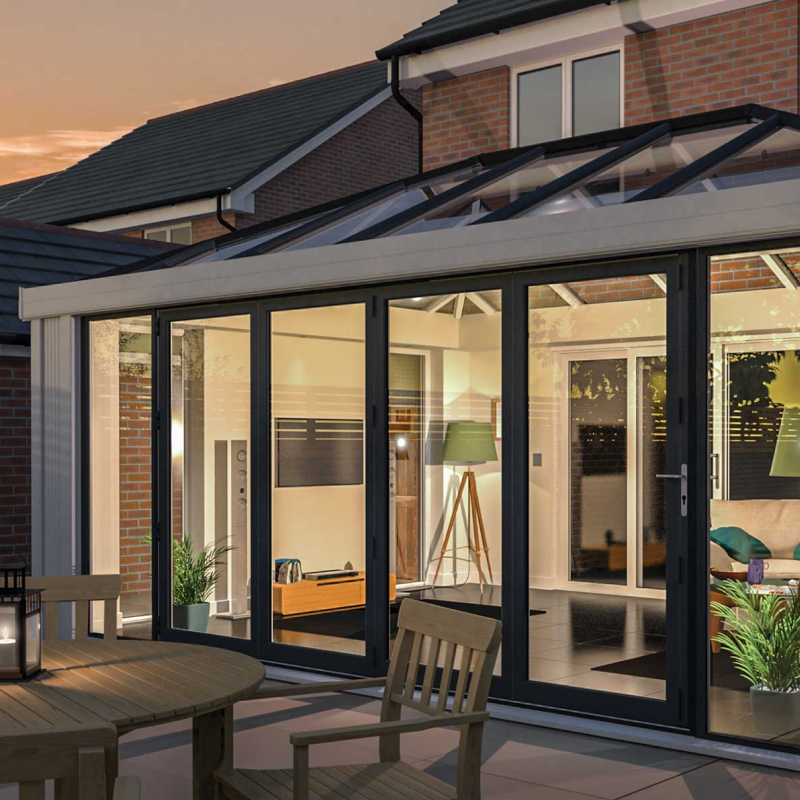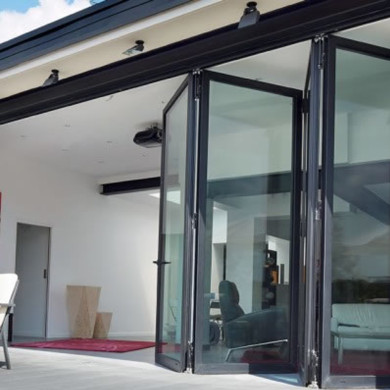Bi-fold doors are typically a set of 2 or more standard size glass doors that open in a concertina style and neatly fold flat when open. Unlike a sliding patio door, that remains only half open, Bi-fold doors fully open to seamlessly connect your living space with your terrace, patio or garden.